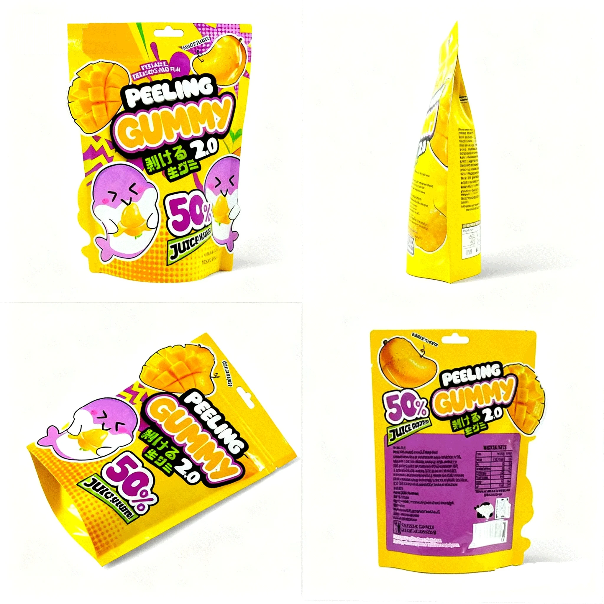Custom resealable gummy packaging mylar bags are specially designed for premium gummy candy, soft candy and chewy snack products that require strong moisture protection, freshness retention and attractive retail presentation. The stand-up flat bottom structure provides excellent shelf stability and maximizes brand visibility in supermarkets, convenience stores and online sales environments.