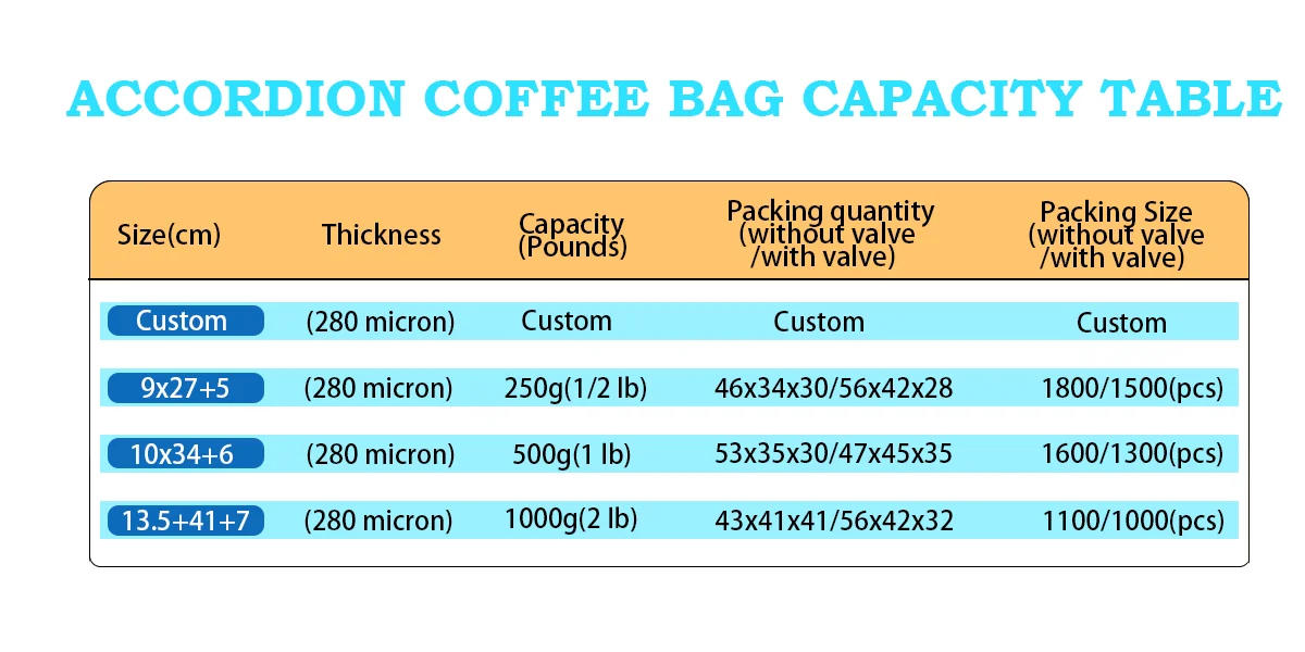 Color & Size Custom bag colors, artwork and dimensions; common 250 g / 500 g / 1 kg coffee packs; additional sizes on request