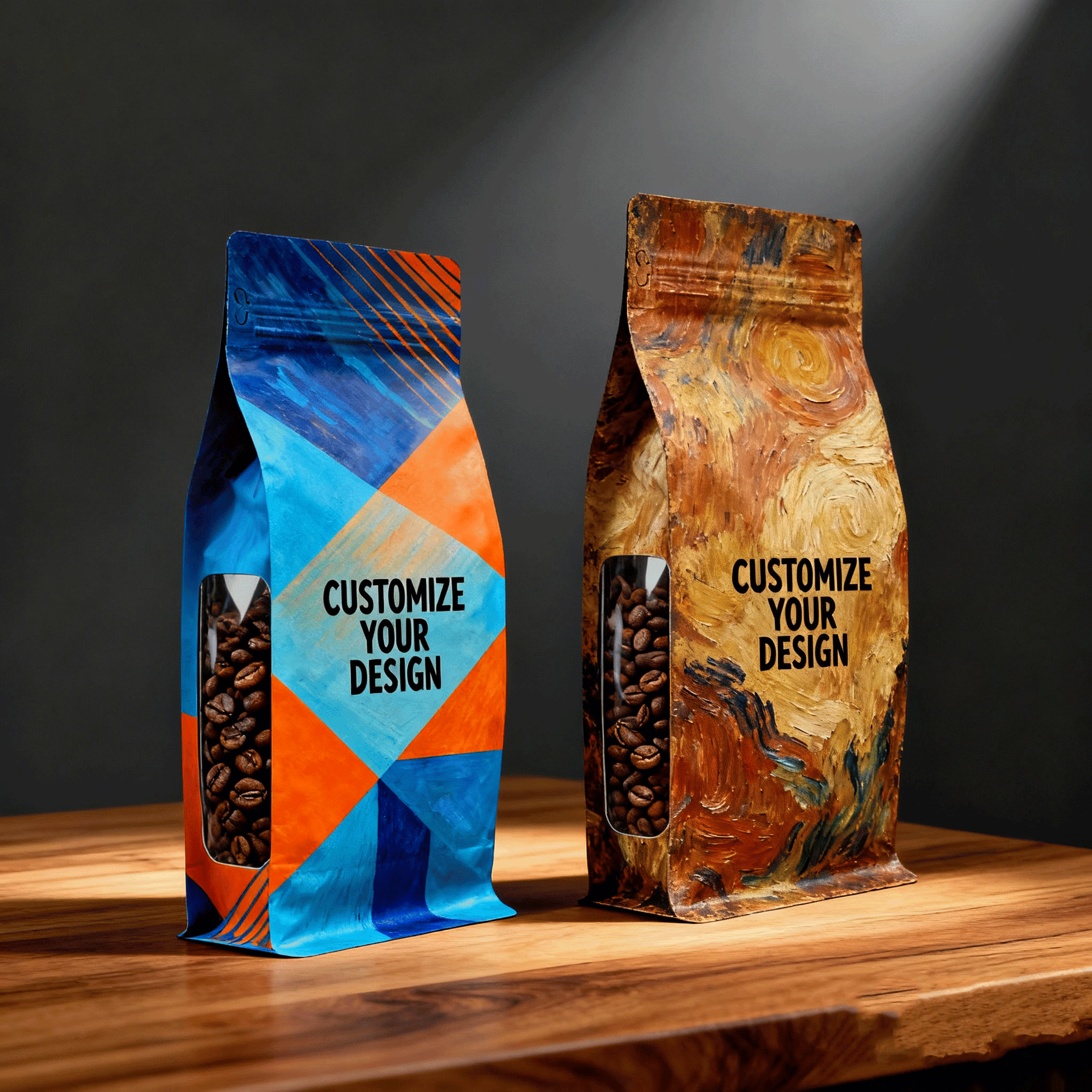 Features Flat-bottom stand up structure, resealable zipper closure, transparent side window, optional one-way degassing valve, matte or gloss finishes, strong heat-seal edges