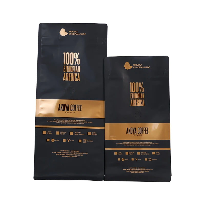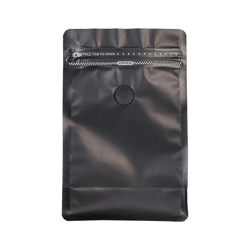 Features Eight-sided seal, stand-up base, aluminum foil laminate, optional degassing valve, resealable zipper