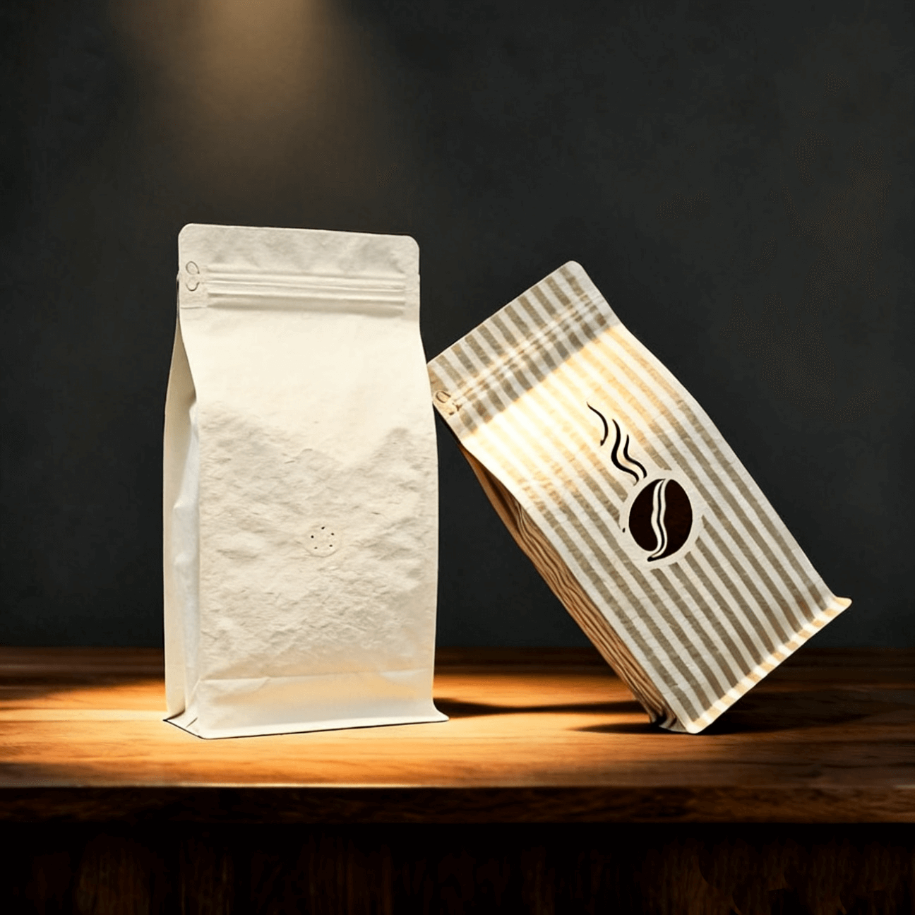 Engineered for maximum barrier protection, these pouches feature a high-performance one-way degassing valve that releases CO2 from fresh roasts while preventing oxygen entry. The packaging is constructed with premium materials, ranging from natural kraft paper to luxurious matte black foil and textured paper finishes. A heavy-duty resealable zipper and tear notches are integrated to maintain aroma and flavor after the package is opened.