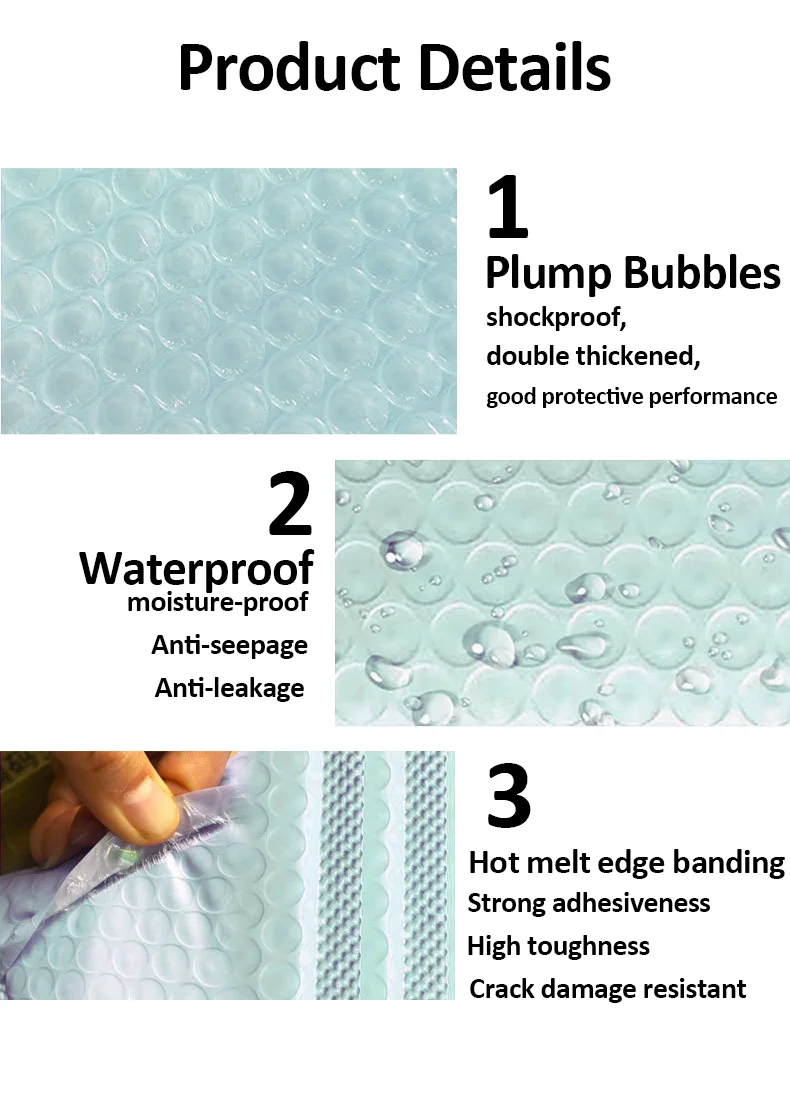 Features Self seal adhesive strip, waterproof outer layer, thick shockproof air bubbles, lightweight and tear-resistant structure.