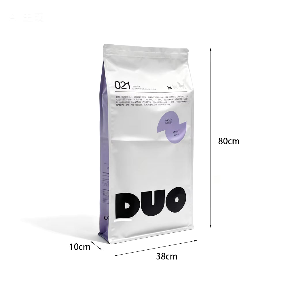 This custom resealable foil zipper pet food bag is designed for secure storage and premium presentation of dog and cat food in large-capacity formats. The aluminum foil laminated structure offers excellent moisture, oxygen, and odor barrier protection to keep pet food fresh and nutritious for extended periods. The sturdy side gusset design improves standing stability for retail display, while the wide resealable zipper allows repeated opening and closing without product leakage. It is ideal for dry kibble, treats, and bulk pet food packaging in both retail and distribution environments.