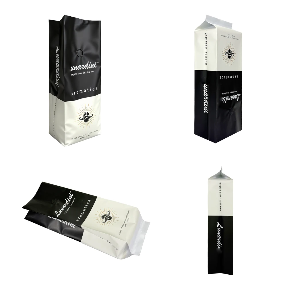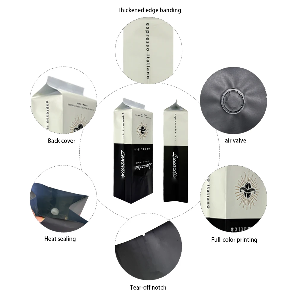 Features Side gusset structure, one-way degassing valve, strong barrier, heat sealing, custom printing