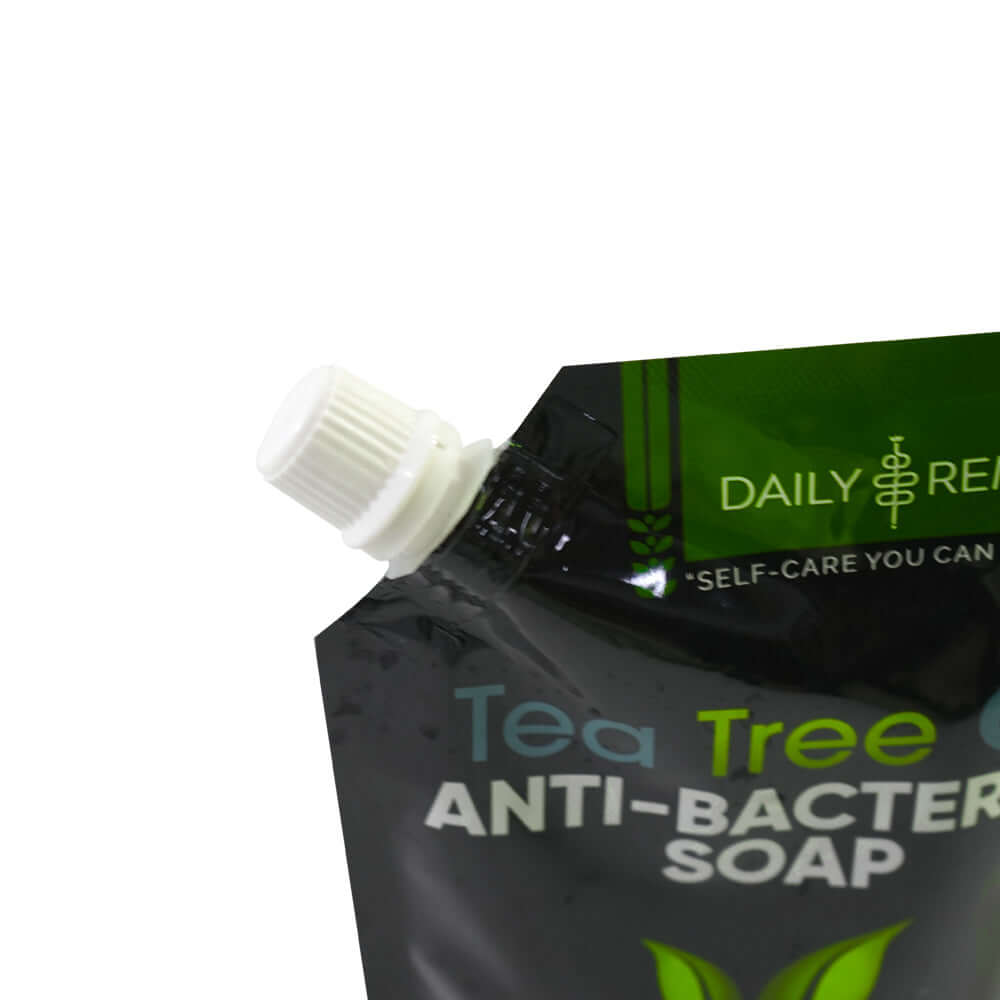 The pouch is produced with food-grade laminated plastic material to provide dependable barrier protection for liquid contents. The flexible body combined with reinforced edge sealing improves durability during filling, shipment, and repeated consumer use. The smooth printable surface supports clear branding presentation and product information display for retail packaging.