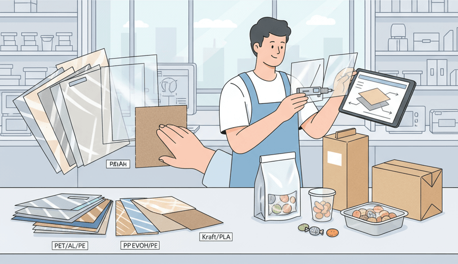 Common options include PET/AL/PE, PP/EVOH/PE, and Kraft/PLA films.